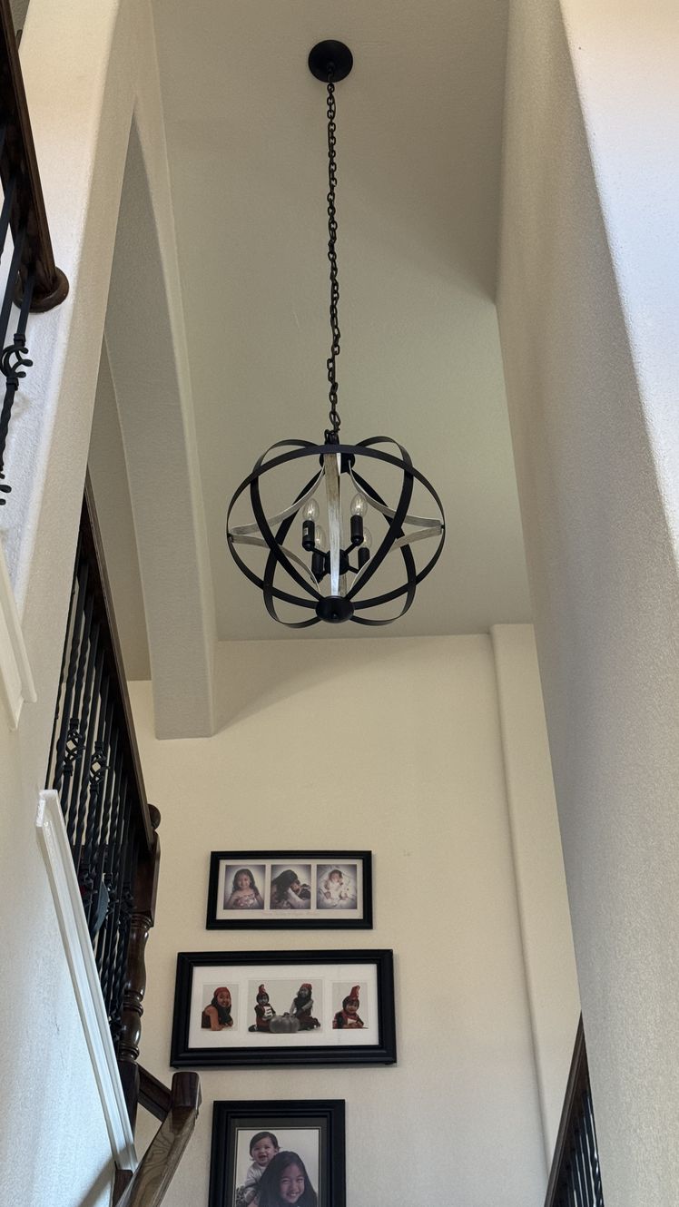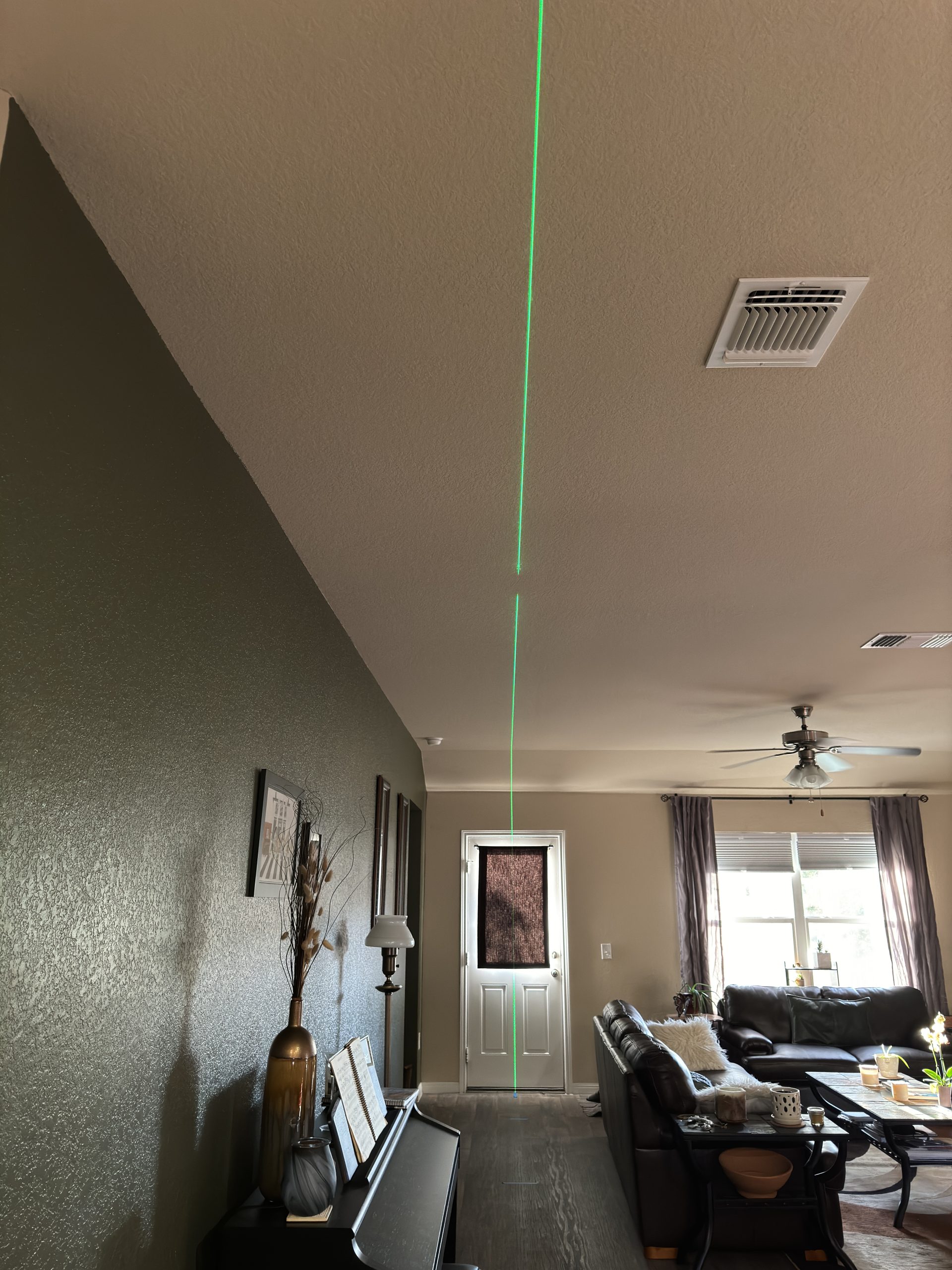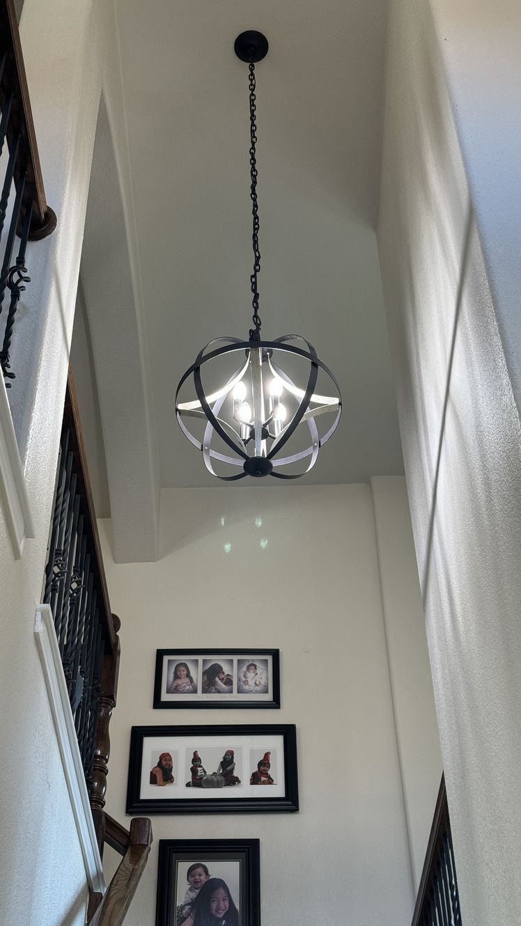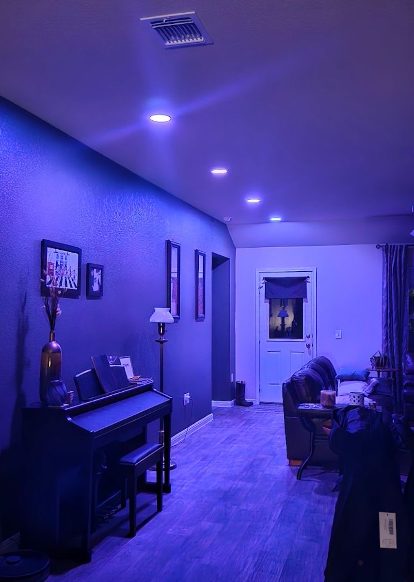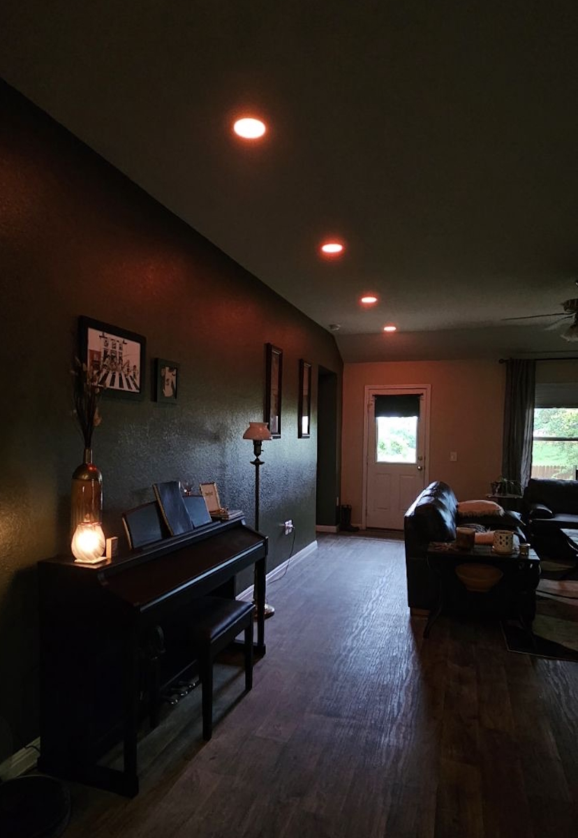 Added a set of LED can lights in specific locations in a client’s living room. Client requested that backdoor light be centered on that door as well as the primary bedroom door. Then the first light be directly above the piano and the remaining two lights be equally spaced between the first two lights.