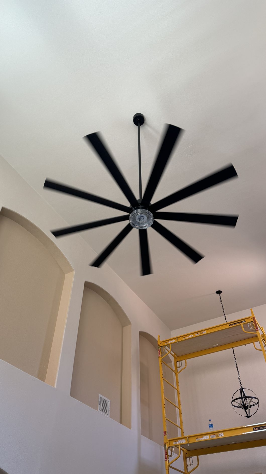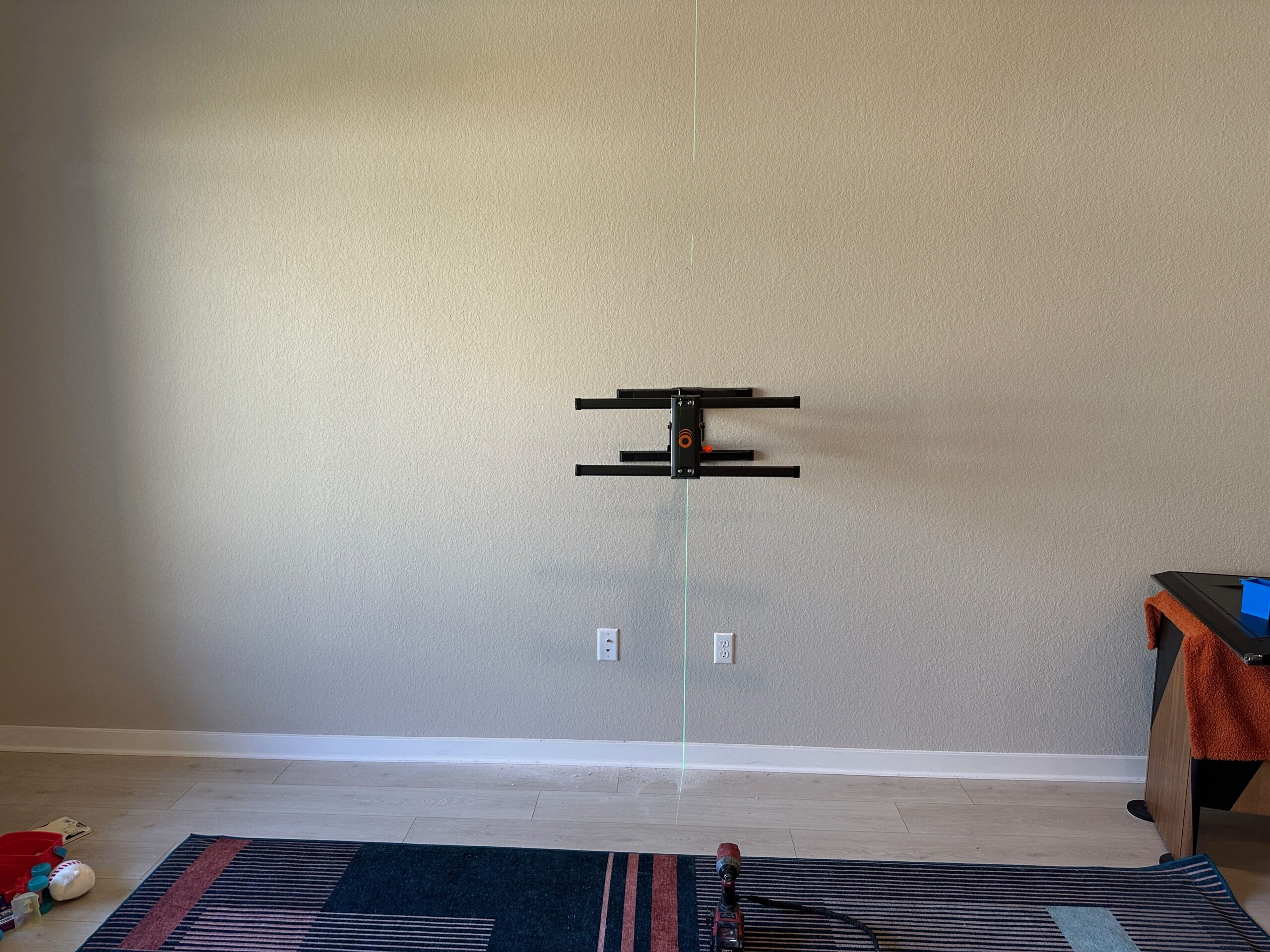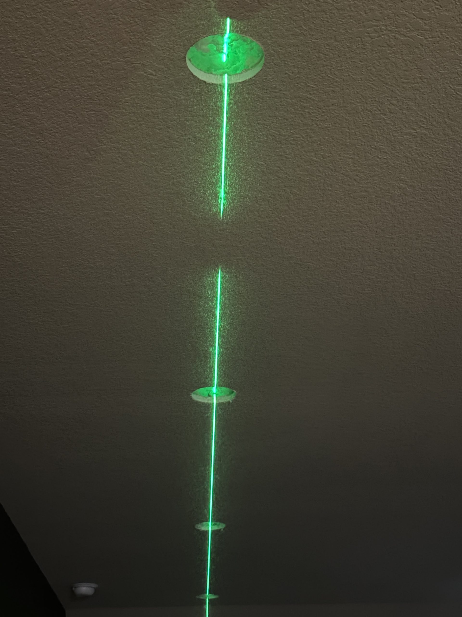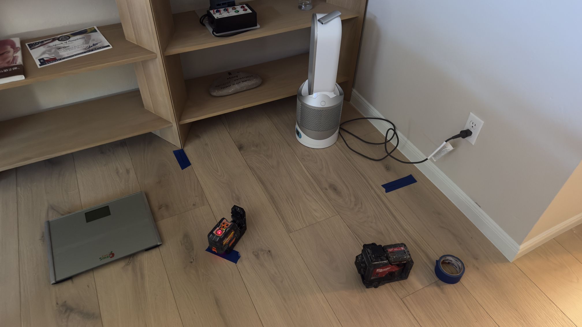 The blue tape on the ground and the lasers help us find the center of each light and to help ensure that the lights are equally spaced.